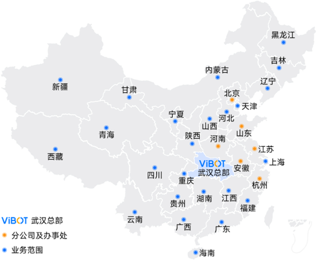 ViBOT驿宝通业务范围覆盖湖北、北京、上海、天津、重庆、黑龙江、吉林、辽宁、河北、山西、江苏、安徽、福建、山东、河南、湖南、广东、海南、四川、贵州、云南、陕西、甘肃、青海、内蒙古自治区、广西壮族自治区、宁夏回族自治区等省市自治区直辖市。